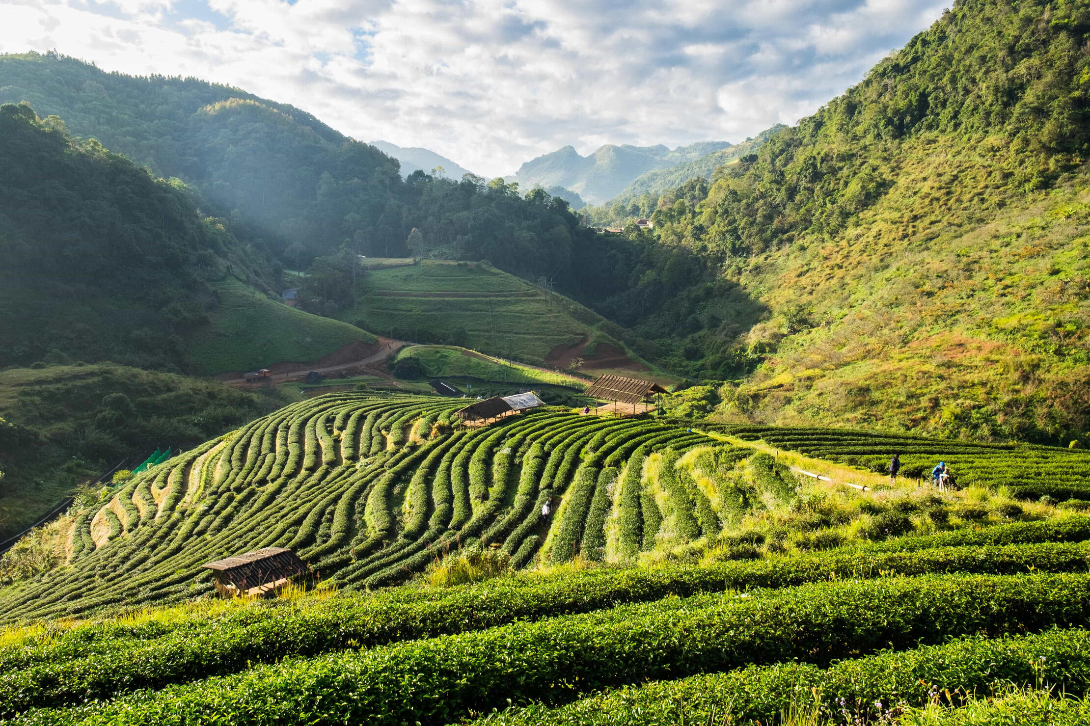 Harvesting: mature tea leaves are picked, typically from the lower parts of the tea plant.